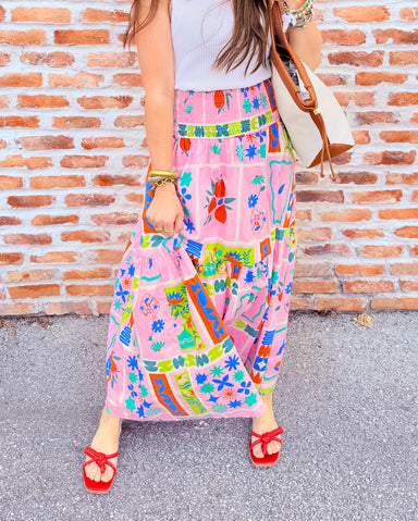 Embrace effortless elegance with this flowy printed maxi skirt! Featuring a vibrant floral frame print and tiered silhouette, it offers all-day com...