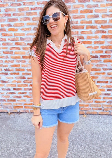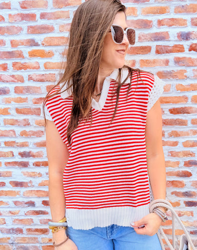 Stay stylish with the Red Stripe Sweater! This sleeveless knit is lightweight and perfect for transitioning seasons. Its bold design adds a fun twi...