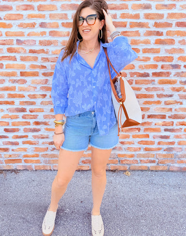 Effortless elegance meets playful style with the Adrianna Burnout Top. This soft blue blouse features a delicate burnout floral pattern layered wit...