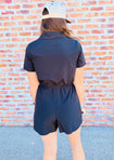 This adorable black romper features a solid design with a cinched waist, a charming collar, a playful tie at the waist, and handy front pockets.