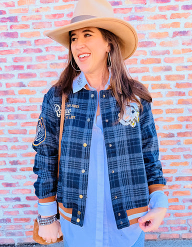 This plaid bomber jacket fuses Western swagger with rock 'n' roll attitude. The back showcases a striking bucking bronco and flag graphic that spea...