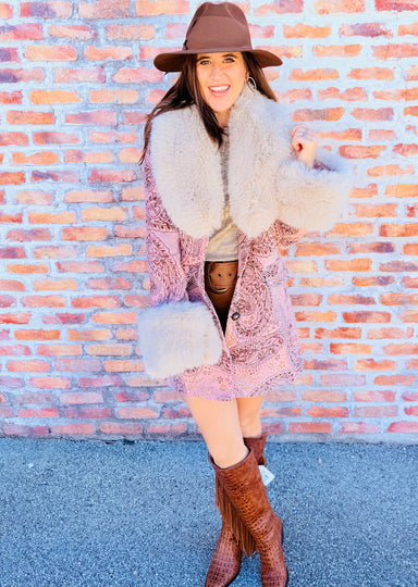 Step into the spotlight with the Mercer Coat, a groovy throwback to '70s glamour. This show-stopping piece flaunts a plush faux fur collar and cuff...