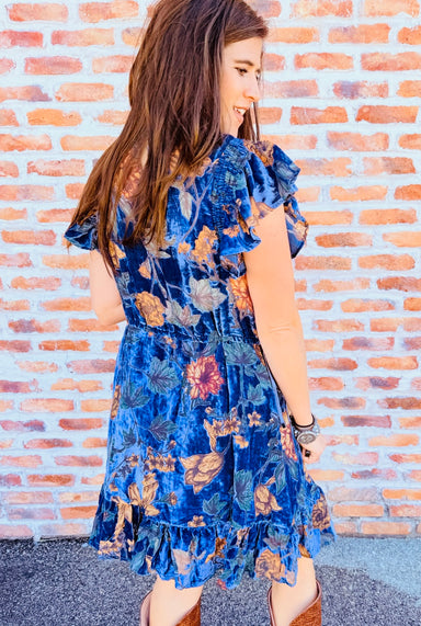 Printed velvet midi dress, flutter sleeve & ruffle high neck finish elastic waist & side ties in floral print burnout process. Elegant flor...