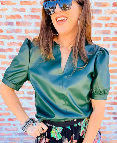 Kalia v-neck puff sleeve top in faux leather combines elegance and modernity with its sleek design. Crafted to offer both comfort and style, this t...