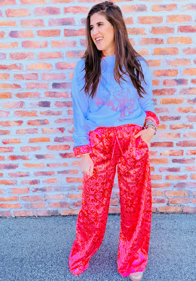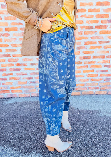 Rock a playful vibe in these barrel jeans featuring an eye-catching bandana print. Designed with a mid-rise, slouchy silhouette and wide legs that ...