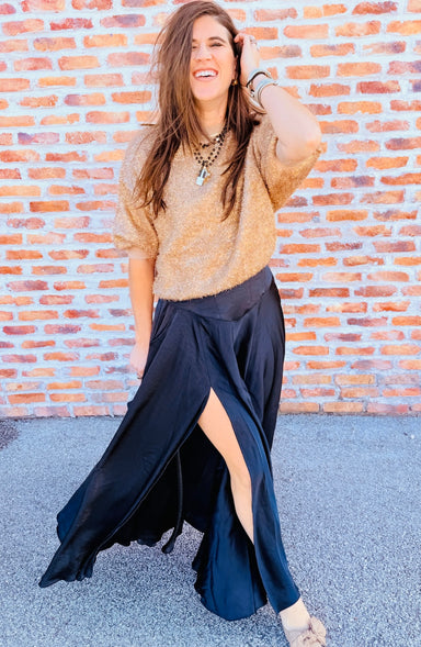 This satin maxi skirt is pure elegance with a twist—the flowing A-line silhouette glides beautifully with every step, while the sharp pointed waist...