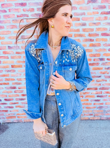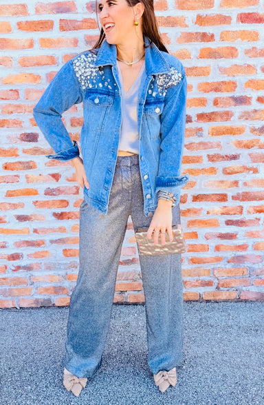Slip into the Janette and let those sparkly crystals do the talking. This oversized button-down jacket pairs a timeless collar with just enough gli...