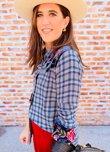 This charming western-inspired top blends classic cowgirl vibes with contemporary flair. The airy plaid fabric drapes beautifully through voluminou...