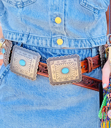 Saddle up in style with this eye-catching leather belt that brings Western flair to any outfit. Featuring striking rectangle conchos with vibrant t...