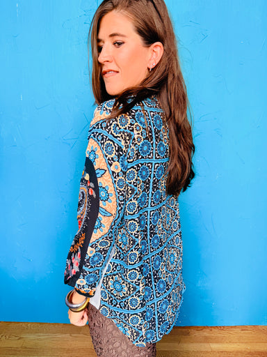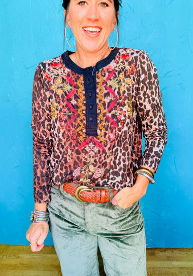 This Leopard Mixed Media Henley showcases an allover leopard print paired with charming floral embroidery across the upper part. With a Henley butt...