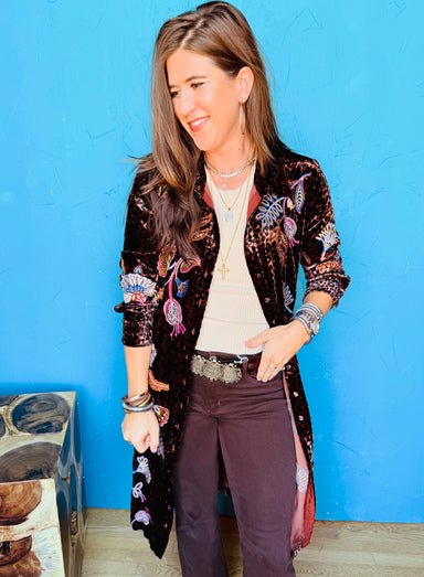 The Gineva Velvet Shirt Dress features a breezy, soft fabric decorated with a lively floral print. Throw this collared button down over a basic tee...