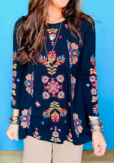 The Brandi Raw Seam Swing T-Shirt is made from soft, breathable 100% cotton and showcases colorful floral embroidery. With a comfy crew neck and br...