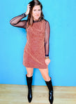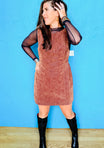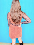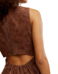 This sleeveless gem showcases a distressed faux suede fabric in a warm brown shade, complemented by delicate seams that enhance your silhouette. A bold open back featuring an elastic waistband and snap accents, adding a fun, modern flair to this classic design. With a high neckline and a back zip, this mini skirt is your go-to for festival fun or a night out with a touch of Western charm.