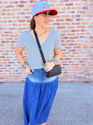 This two-tone denim maxi skirt from We The Free is sure to make any outfit turn heads. Its the perfect staple for any rodeo fit! Lynette is wearin...
