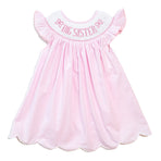 The sweetest Big Sister Dress to celebrate your new arrival! Adorable smock plate with "Big Sister" flanked by two smocked bows on a pink gingham fabric complete this adorable look.
