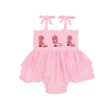 Adorable crawler perfect for little adventurers! This charming piece features a smocked chest with boot embroidery, delicate bow shoulder straps, a...