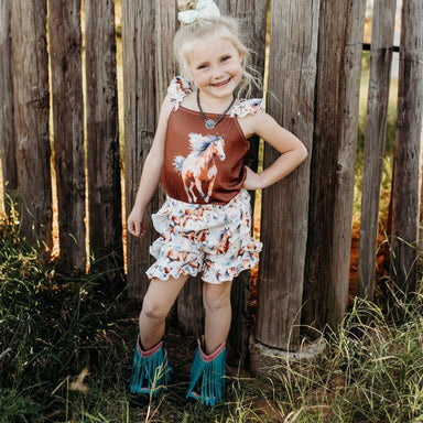 A westward trend for first style moments. Our romper in pure cotton features an allover western toile, puff sleeves and ruffle details. 100% Cotto...