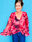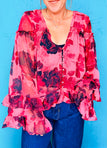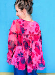 This dreamy blouse delights with its airy, sheer fabric and charming allover ruffles that add playful texture. Its oversized, billowy silhouette flows effortlessly, complemented by fluttery sleeves and a button-front detail for a whimsical touch.