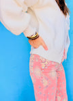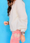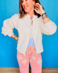 Cozy up in this creamy cardigan sweater, designed with fun front ties and full-length sleeves for a playful twist. It’s the perfect way to stay warm and bring a bit of whimsy to your daily style. Ideal for layering on those cool days or adding a gentle, fashionable touch to any ensemble.
