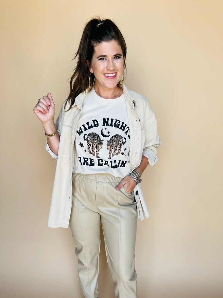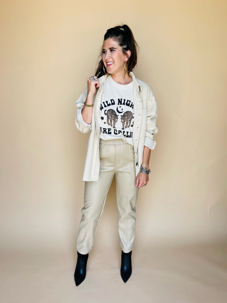 Step up your leather pant game with these cool ruffle elastic waist straight crop pants. Front pockets and center seam detail stitching create a s...