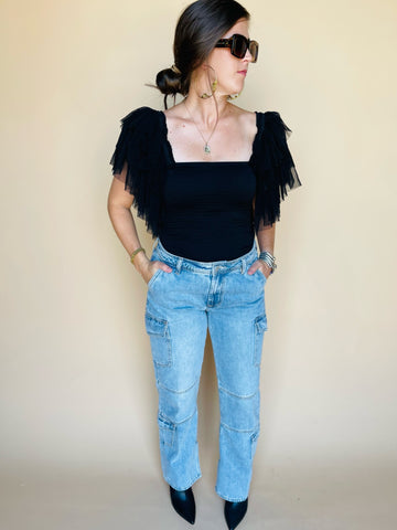 High rise cargo straight jeans. It's the pragmatic fit that sits at natural waist and fitted slender from the hip to mid thigh. Full inseam on rigi...
