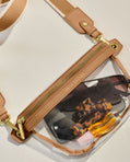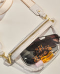 Our Stadium Belt Bag is your new go-to for festivals, concerts, and game days. Made from durable clear PVC with sleek vegan leather trims, it's stadium-approved and effortlessly stylish. The adjustable wide canvas strap lets you wear it your way, hands-free as a crossbody or belt bag, while keeping your essentials secure and close to hand, whether you're dancing, cheering on your team, or on the move.