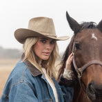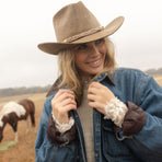 A fun twist on the classic cowgirl silhouette, this flecked almond felt hat features a charming braided recycled silk sari ribbon paired with shiny rose gold metallic details for an extra pop.