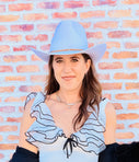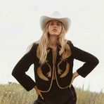 Our modern interpretation of the cowgirl shape in an ivory felt with brown suede trim, accented with brass bead detail and a sustainably-sourced pheasant feather