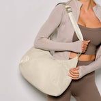 This stylish yet practical Nylon-Luxe Sling Shoulder Bag in Chalk features a durable, water-resistant nylon material. Thoughtfully designed with an adjustable strap, it can be worn as a shoulder bag or a crossbody sling. The roomy interior makes it the perfect companion for the gym or for creating a relaxed athleisure look in your everyday routine.