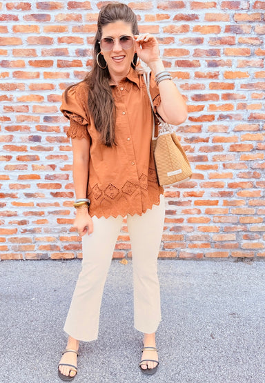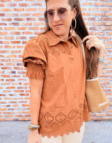 Get ready for Fall with this stunning Montreal Top in a gorgeous brown hue! Featuring a pull-on design, button down front, and a classic collar, th...