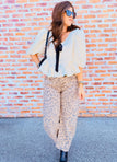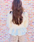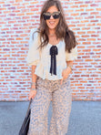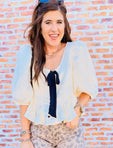 This darling top oozes feminine charm with its timeless scoop neckline and adorable puffy sleeves topped with contrasting bows. The playful ruffled hem adds a flirty touch, while the relaxed fit keeps things comfy and cool.