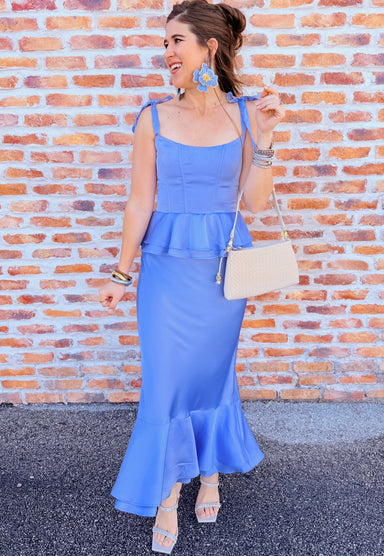 Elevate your wardrobe with the Pauline Peplum Dress—where fun meets fashion. This charming piece showcases adjustable tie shoulders, a structured b...