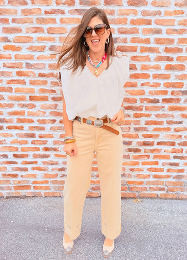 Experience the perfect blend of style and comfort with these high rise cuffed hem straight leg jeans in a stunning mojave desert hue. Crafted in a ...