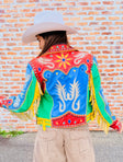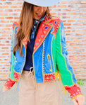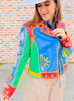 This season’s must-have biker jacket is turning heads and winning hearts everywhere. Featuring a bold mix of primary colors, it shines with luxurious leather inlays and appliques. Classic studded details, along with bright yellow fringe and buckle accents, add a fun and edgy twist to this standout piece.