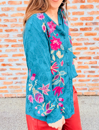 Embrace the lively and colorful floral embroidery that embellishes this blouse, infusing your outfit with a creative and spirited vibe that’s perfe...