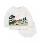 Get cozy in style with this charming two-piece ensemble! Showcasing an adorable intarsia-knit horse motif, playful ruffle accents, and a snug ribbed waistband, it's the perfect combo for those crisp autumn days. Soft, comfortable, and undeniably cute—your new favorite layering set awaits.