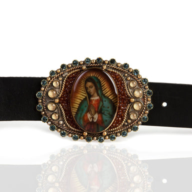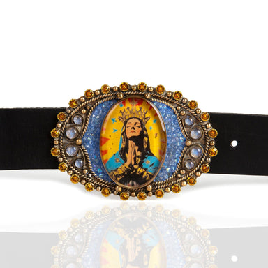 This classic image buckle features a bold pop art Virgin Mary, set beneath a glossy resin dome and surrounded by sparkling Austrian crystals. Sacre...