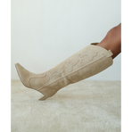 Tall vegan suede boot with western-inspired stitching, pointed toe, and slim high heel.