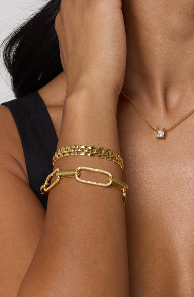 Our Grecian Link Bracelet is made from durable 18K Gold PVD coating, making it certified waterproof, sweat-proof, and life-proof. Featuring a class...