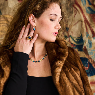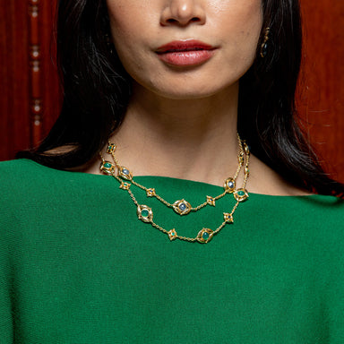 This double-faced gold chain necklace dazzles with sparkling brightness, featuring green onyx and deep blue labradorite eyes that catch the light a...