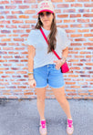 You will want these in every color! Discover the perfect blend of style and comfort with our high rise denim shorts in a chic light wash, featuring a trendy fray hem that adds a touch of flair to your wardrobe. Designed with a mid high rise, these shorts offer versatile wear, making them an essential addition to your collection of bottoms.