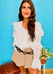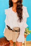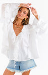 The Joss Ruffle Top is your ultimate boho favorite! Featuring a flowy oversized silhouette and flouncy bell sleeves, it’s perfect for laid-back vibes. Soft ruffle details and a breezy flyaway hem add a flirty touch. Style it loose with mini shorts on warm days or tuck it into high-waisted jeans when the weather cools off.