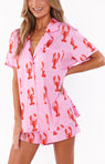 Get ready to snooze in style with this playful PJ set featuring a lively lobster print. Perfect for a fun and carefree Sunday morning, this set comes with a button-up top and comfy elastic waist shorts. Just slip on your favorite slippers and get ready for some serious snuggling!