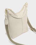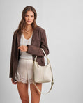 The Hallie Satchel Bag in Oyster showcases a softly scooped silhouette that fits comfortably under the arm. Its double-strap design allows it to be worn multiple ways, either as a shoulder bag, crossbody, or top-handle bag.