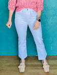 These ankle length pants, the Shy Girl, are perfect for any occasion. With a vintage wash and cropped flare design, they can be paired with any type of shoe. Plus, their raw-edge hems add a relaxed touch to the stretch-enhanced denim, providing day-one comfort.