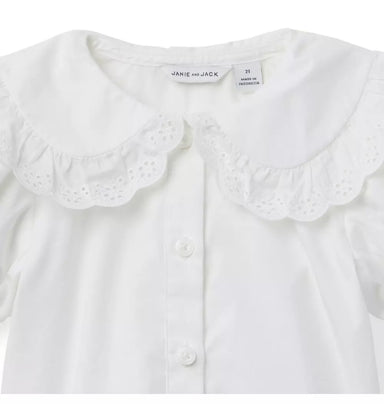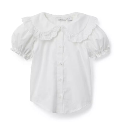 Dainty details for this top favorite. In pure cotton poplin with a lace-trimmed collar, puff sleeves and ruffles at the cuffs. 100% Cotton Poplin
