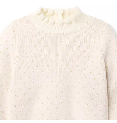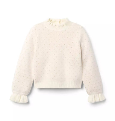 Style is spot on in our dot sweater. With hints of sparkle, ribbed details and ruffles at the collar and cuffs. 62% Combed Cotton/16% Rayon/13% Ny...
