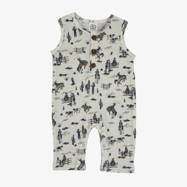 A westward trend for first style moments. Our romper in pure cotton features an allover western toile, puff sleeves and ruffle details. 100% Cotto...