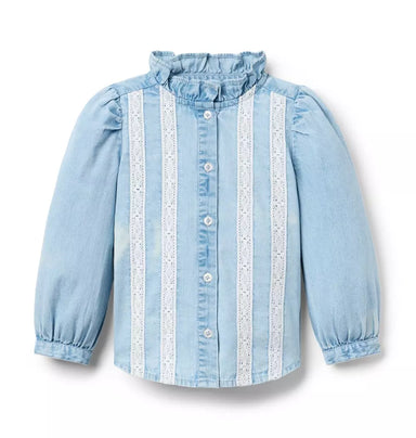 Our chambray top gets a fashionable twist with lace details. A ruffle collar makes it even better. 100% Cotton Chambray