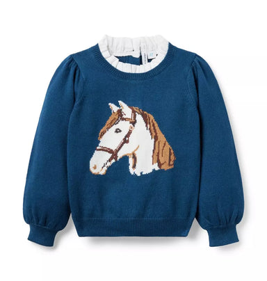 Take the reins in our intarsia-knit horse sweater. A contrast ruffle-trimmed collar and puff sleeves make it even better.